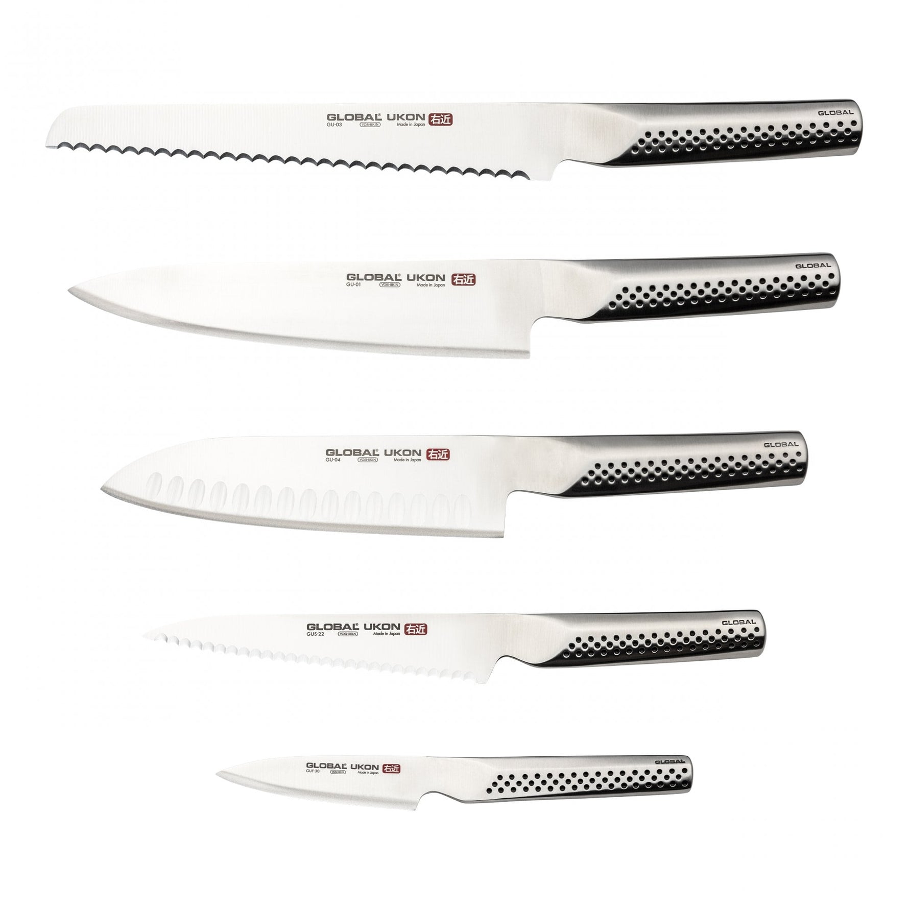 The Ukon 6-Piece Knife Block Set is a real showpiece! It features a stylish and contemporary stainless-steel and black design that will complement any kitchen setting. The knife block includes the GU-01 20cm Chef’s Knife, the GU-03 22cm Bread Knife, the GUM-10 14cm Vegetable Knife, the GUS-22 15cm Scalloped Utility Knife and the GUF-30 9cm Paring Knife.