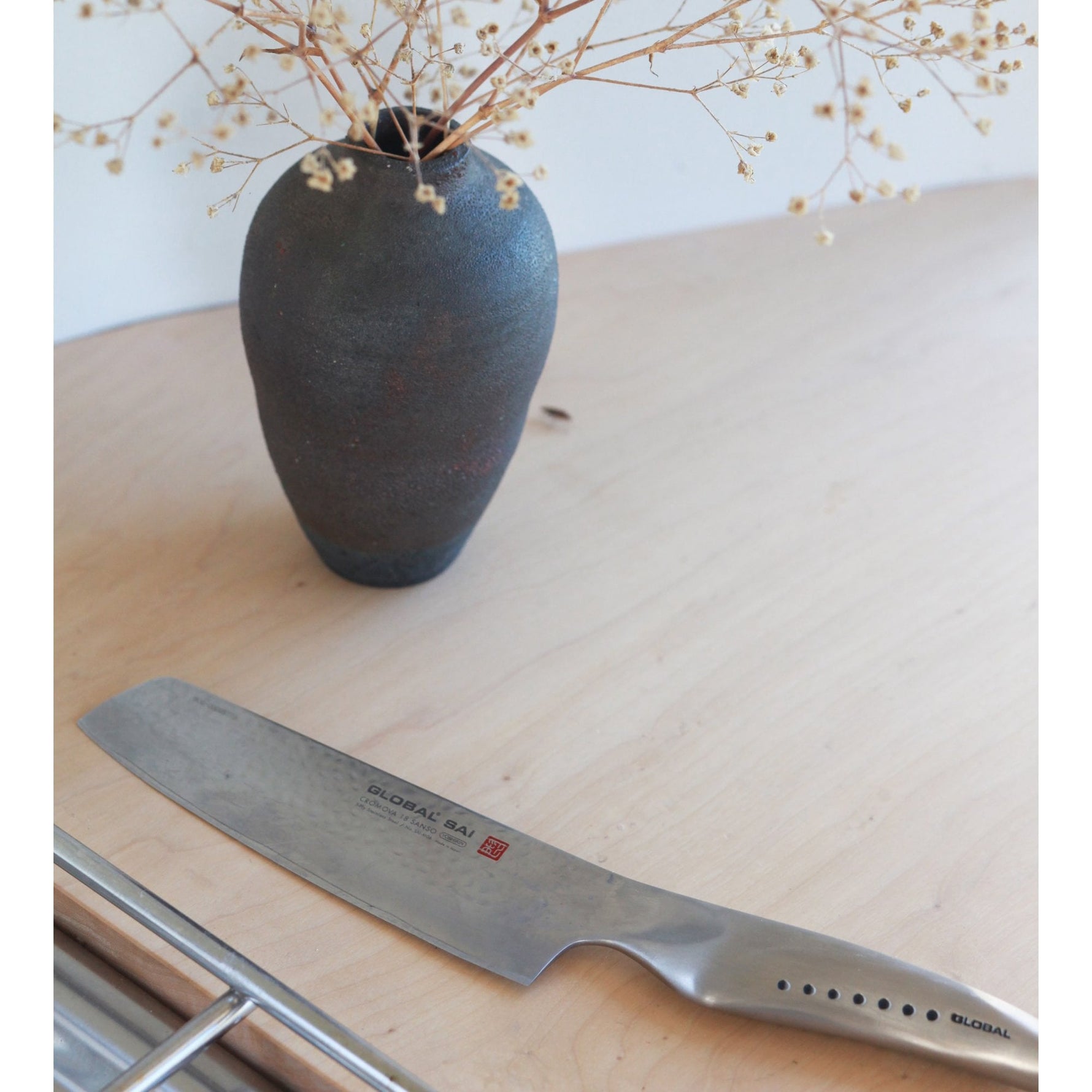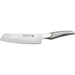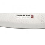 Global SAI has two vegetable knives in its range. The SAI-M06 is a specialist vegetable chopping knife. It has a long flat blade designed to get a clean cut when the knife cuts down onto the board. It is quite a heavy knife and suitable for long hours in the kitchen. With its 15cm blade and the stretched handle of the SAI series, the SAI-M06 knife is the smallest vegetable chopper Global produce. It has a bigger brother, the SAI-04, which chefs will find a bit more manageable as it has a 19cm length. This makes it more similar to the popular G-5.